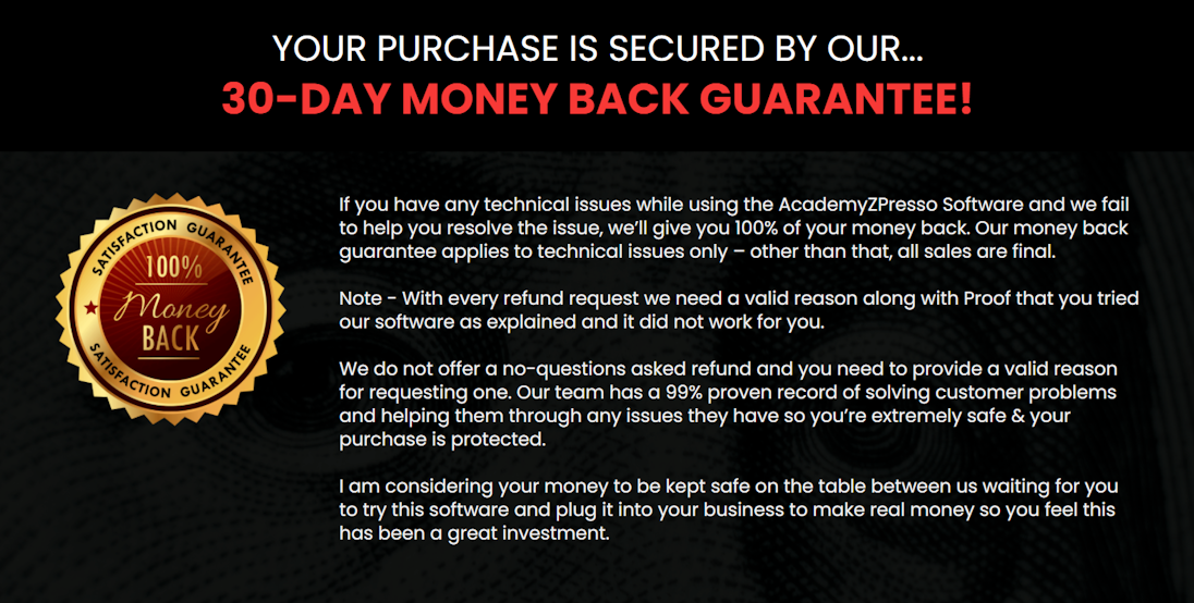 P.P.P.P.P.S. We’re so confident that you’re going to absolutely love AcademyzPresso that we’re including an unheard of 90-day money back guarantee so your investment is 100% safe. Put it into action and if it doesn’t work for you, simply send us a ticket and we’ll refund every penny you paid